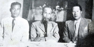 Cựu hoàng Bảo Đại (phải) và Hồ Chí Minh (giữa). Ảnh chụp tháng 8/1945. Nguồn: Henri Estirac