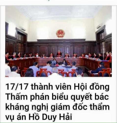 Sự sống chết của tử tù HDH trong phiên xử kháng án không do những bằng chứng mà chỉ do những cánh tay giơ lên : Hồ Duy Hải nhất định phải chết ! Thế nên HDH bắt buộc phải chết – chết theo kiểu đấu tố giơ tay biểu quyết là mau và chắc ăn nhất ! Khi 17 cánh tay đưa lên : HDH phải chết ! Giết nó ! Tòa án giống hệt nơi giang hồ đấu tố xử đồng bọn !