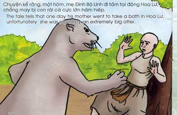 “Tại trang 14, tác giả viết: “Chuyện kể rằng, một hôm, mẹ Đinh Bộ Lĩnh đi tắm tại động Hoa Lư, chẳng may bị con rái cá cực lớn hãm hiếp”. Đi kèm là ảnh minh họa vẽ một con rái cá to như người xông tới người phụ nữ đang co rúm, sợ hãi.”