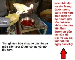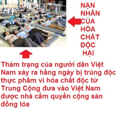 Trung Cộng giết lần dân tộc Việt Nam qua sự tiếp tay của Cộng Sản Việt Nam bằng cách đưa hóa chất độc hại vào nước ta. Mục đích làm ảnh hưởng đến sức khỏe của dân tộc Việt Nam để người dân không còn đủ sức mạnh chống lại sự xâm lăng nước ta. Dưới dây là một số hình ảnh nguy hiểm được ghi nhận:
