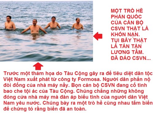 Người dân trong nước đòi hỏi phải dẹp nhà máy Formosa nhưng bọn thái thú CSVN vẫn bao che cho nhà máy nầy theo lệnh của Tàu Cộng. Chúng bày trò trẻ con đưa nhau tắm biển để cho rằng biển đã sạch và an toàn như hình ảnh dưới đây.