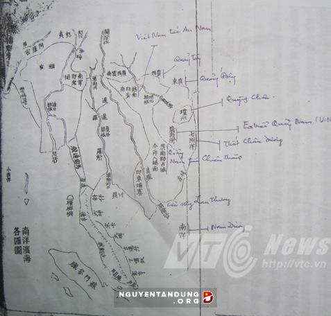 Bản đồ đã chú thích trong đó có ghi eo biển Quảng Nam và đảo Thất Châu Dương cùng bản đồ Việt Nam
