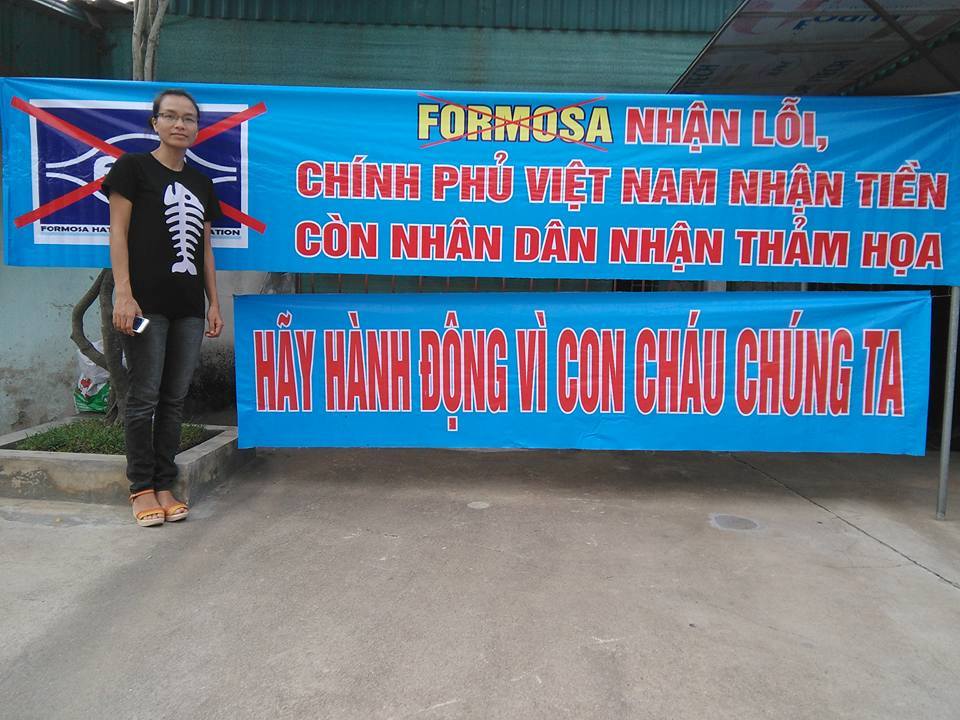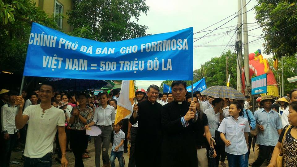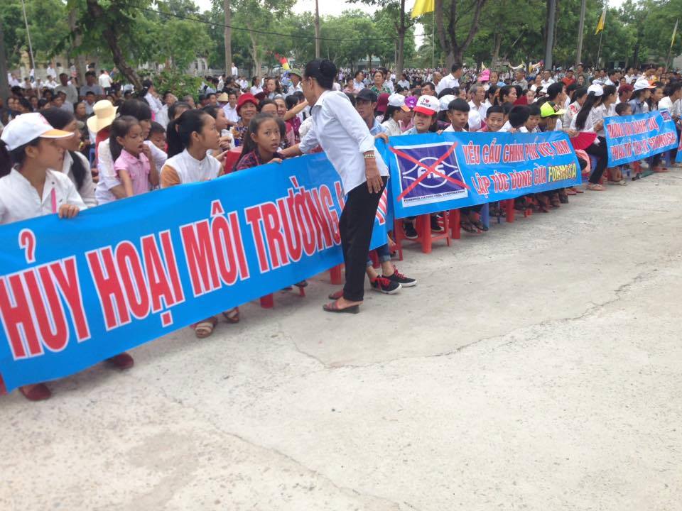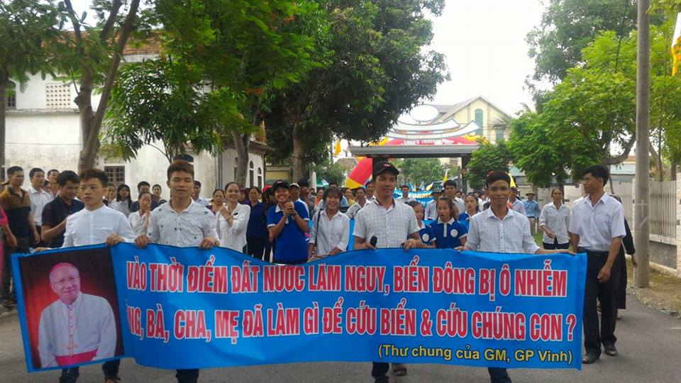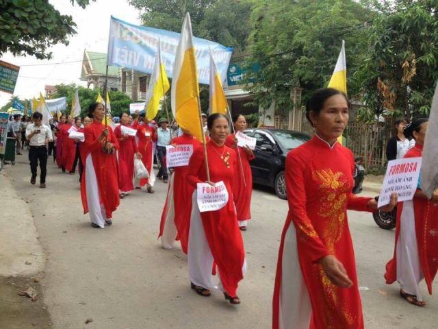 Những khẩu hiệu mọi người cầm trên tay: “Huỷ hoại môi trường là huỷ hoại cuộc sống”, “Yêu cầu chính phủ đóng cửa FormosaFormosa, “Formosa nhận lỗi, chính phủ Việt Nam Nhận Tiền, còn Nhân dân nhận thảm hoạ”, “Hãy đồng hành vì con cháu chúng ta”, “Vào thời điểm đất nước lâm nguy, biển đông bị ô nhiễm, ông bà cha mẹ đã làm gì để cứu biển, cứu chúng con?”, “Mẹ địa phận Vinh ơi, Formosa đang huỷ diệt con cái của mẹ”, và hô vang “Bảo vệ môi trường là bảo vệ chính mạng sống mình”, “Yêu cầu chính phủ đóng cửa Formosa”