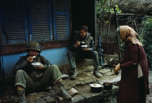 Chém cơm của người Mẹ Việt Nam với hai người lính trẻ Hoa Kỳ Tại vùng ven đô Huế, Mậu Thân 1968.